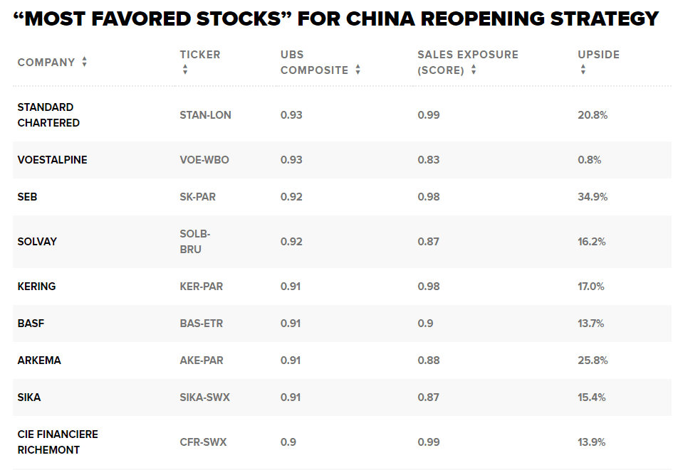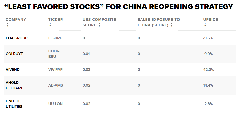 Stále však panuje nejistota ohledně toho, kdy by Peking mohl svou politiku zmírnit. Ale až se tak stane, švýcarská banka UBS identifikovala v indexu MSCI Europe akcie, kterým se bude dařit lépe než ostatním „v prostředí, kdy se čínský růst obnoví“.