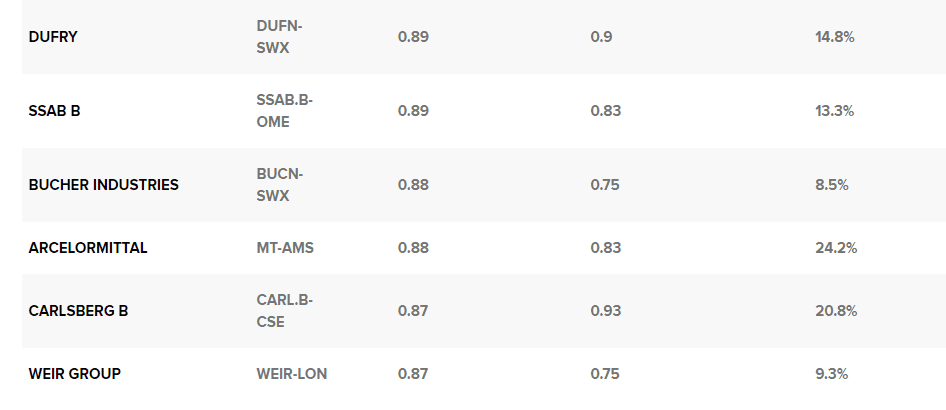 V následující tabulce je uvedeno pět akcií, včetně belgické elektrárenské společnosti Elia Group, britského dodavatele vody United Utilities, francouzského mediálního gigantu Vivendi a evropských supermarketů a maloobchodních prodejců Colruyt a Ahold Delhaize.