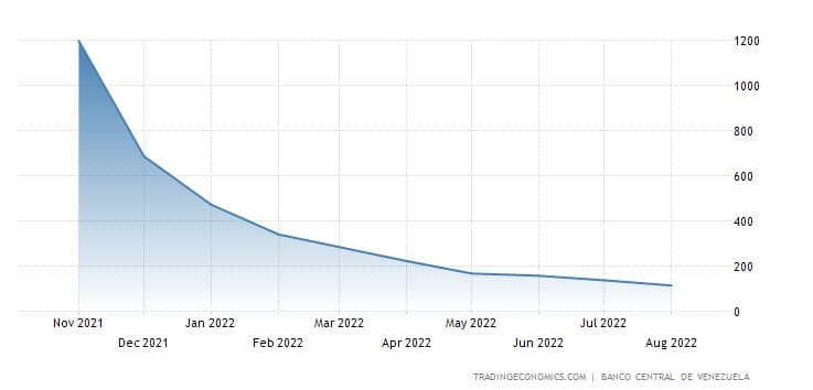 Podle indexu sestaveného agenturou Bloomberg ceny za poslední tři měsíce vzrostly o 359 % ročně. To je sice výrazně méně než nejdivočejší hyperinflační maxima posledních let – v roce 2019 index dosáhl hodnoty kolem 300 000 % -, ale oproti začátku letošního roku je to výrazný nárůst.Prudký nárůst cen odhaluje důležitou změnu Madurovy politiky. Po letech omezování výdajů a snižování nafouklého rozpočtového deficitu vláda opět uvolňuje peněženku a vydává peníze na všechno možné, od bonusů na dovolenou až po almužny pro věrné socialistické strany. Všechny tyto dodatečné peníze v ekonomice podporují pokles hodnoty bolivaru vůči dolaru a zvyšují spotřebitelské ceny.„Venezuela technicky vzato vystoupila z hyperinflace, ale je uzamčena ve vysokých měsíčních mírách inflace,“ řekl Daniel Cadenas, profesor ekonomie na Metropolitní univerzitě v Caracasu. „Pokud nedojde ke změně hospodářské politiky, neuvidíme nižší než 100% roční inflaci.“Bolest z klesající kupní síly je jedním z důvodů, proč jsou lidé nuceni migrovat, řekl Cadenas. Podle odhadů OSN opustilo zemi v posledních letech již více než 7 milionů lidí, přičemž desítky tisíc se jich letos objevily na hranicích s USA.Inflace za poslední rok – Zdroj: Tradingeconomics.com„Venezuela má ceny výrobků jako v Dubaji, zatímco lidé dostávají platy jako v Súdánu. To se týká především chudých, 93 % obyvatel,“ řekl Cadenas.Tím, že Madurova vláda umožnila volný oběh amerického dolaru, podnítila zvýšení spotřebitelských výdajů, což spolu s mírným nárůstem těžby ropy způsobuje překvapivé hospodářské oživení. Podle Mezinárodního měnového fondu by měl hrubý domácí produkt letos vzrůst o 6 %.Maduro toto oživení propaguje jako nepravděpodobný návrat země, na kterou USA uvalily sankce. „Pronásledovaná, mučená, sankcionovaná a blokovaná země našla cestu tím, že využila vlastní motory k aktivaci reálné ekonomiky,“ řekl minulý týden.Venezuela se z hyperinflace dostala v lednu po rozhodnutí centrální banky zvýšit nabídku dolarů na oficiálním devizovém trhu. Tato strategie přinesla na začátku roku určité výsledky, přičemž v březnu se měsíční inflace zmírnila.V poslední době se však růst cen zrychlil. Centrální banka oznámila, že spotřebitelské ceny v srpnu – což jsou poslední dostupné údaje – vzrostly, zatímco opoziční Finanční observatoř uvedla, že meziroční inflace se blíží 157 %. Podle indexu Cafe con Leche agentury Bloomberg – založeného na ceně šálku kávy v Caracasu – dosáhla za poslední rok 158 %.Někteří ekonomové předpovídali, že v roce 2022 bude roční inflace nižší než 100 %.Chcete využít této příležitosti?Venezuela a slabší měnaZdroj: Reuters.com Bolivar za poslední tři měsíce oslabil o třetinu na přibližně 9 bolívarů za dolar. Zmírnění omezení veřejných výdajů vedlo k „výraznému“ zvýšení nabídky místní měny, což zvyšuje poptávku po amerických dolarech, uvedl Cadenas.Tamara Herrera, ředitelka finančně analytické společnosti Sintesis Financiera, uvedla, že tento trend se pravděpodobně ještě zhorší, protože vláda provádí další platby státním zaměstnancům na konci roku, což zvýší poptávku po bolivarech před vánočními nákupy.Vládní výdaje letos vzrostly na 18 % hrubého domácího produktu, zatímco v roce 2021 to bylo přibližně 12 %, odhaduje Herrera. Předpokládá, že v příštím roce dále vzrostou na 21 % HDP.Bolest z vyšších cen a vliv letité migrace pociťuje trh Chacao ve východním Caracasu, relativně bohaté enklávě hlavního města. Tamní prodejci se snaží udržet krok.Mnoho zákazníků kavárny Soni Benavidesové opustilo zemi. Ti, kteří zůstali, nakupují jen to, co potřebují.Sedmašedesátiletá Benavidesová zvažuje, že bude používat levnější a méně kvalitní produkty, aby udržela nízké ceny. Za poslední tři měsíce už téměř zdvojnásobila cenu, kterou si účtuje za velké latté, na 1,95 dolaru . „Buď dobrá kvalita, nebo dobrá cena, není možné mít obojí,“ řekla.