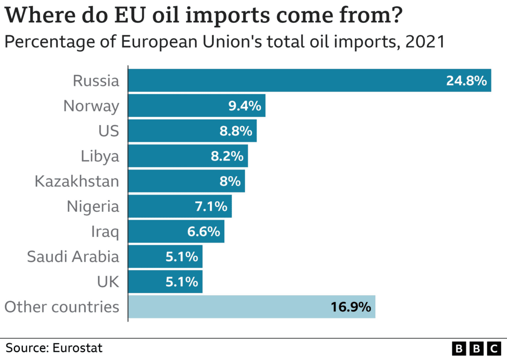 Evropská unie od pondělí zakáže dovoz ropy vytěžené v Rusku a přepravované po moři. Existuje výjimka pro Bulharsko, které může do konce roku 2024 nadále dovážet ruskou ropu po moři na základě smluv, které byly uzavřeny před 4. červnem 2022.