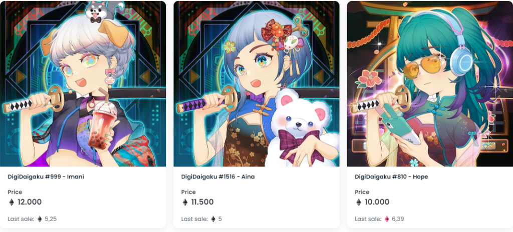 Právě teď se nejlevnější DigiDaigaku NFT prodává na OpenSea za 13,37 ETH, což je asi 20 000 USD.
