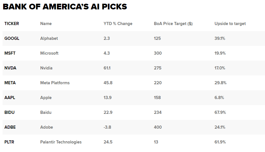 Vzhledem k těmto okolnostem Bank of America v úterý v samostatném sdělení klientům vyzdvihla 15 akcií, které jsou připraveny těžit z větru v zádech AI.
