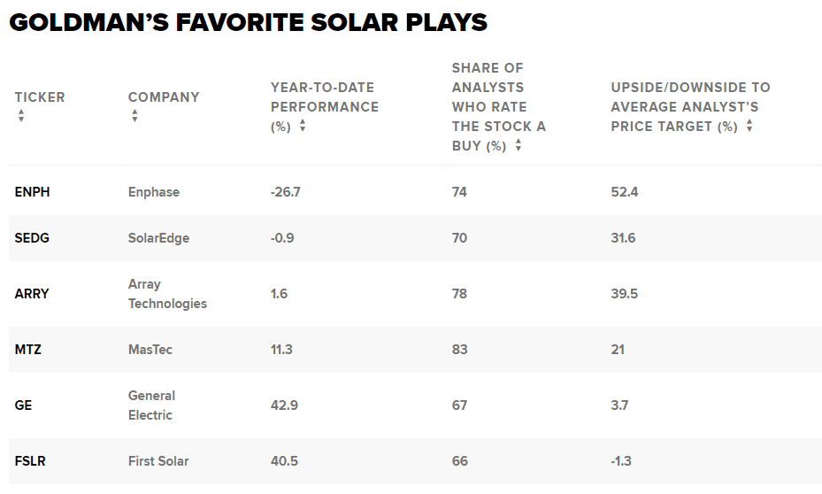 A firma vidí akcie, které budou z tohoto náporu na domácím trhu těžit.Zákon zahrnoval 30% úvěr na instalaci solárních panelů nebo jiných zařízení, která využívají obnovitelnou energii. Lidé však musí jednat během příštích devíti let, aby dosáhli co největších úspor. Třicetiprocentní úvěr lze uplatnit na projekty dokončené mezi 1. lednem 2022 a koncem roku 2032. Na projekty dokončené v roce 2033 a 2034 lze uplatnit pouze 26%, resp. 22% úvěr.„Očekáváme, že v USA také dojde k významnému nárůstu zavádění solárních elektráren, který bude katalyzován rozšířenými pobídkami do příštího desetiletí na základě zákona o snižování inflace, a viditelné známky významného zavádění obnovitelných zdrojů v Číně budou pravděpodobně podporovat udržitelnou expanzi i jinde,“ uvedl v pondělí analytik Brian Singer ze společnosti Goldman Sachs ve zprávě pro klienty.Uvedl však, že rostoucí úrokové sazby a volatilita v bankovním sektoru by mohly poškodit investice v počáteční fázi a přenést pozornost na společnosti zabývající se obnovitelnými zdroji se silnými podnikovými výnosy a rozvahami v USA.Singer rovněž očekává, že Čína zrychlí využívání obnovitelných zdrojů energie a dosáhne emisního maxima do konce desetiletí. Vzhledem k tomu, že Čína v současné době drží přibližně 90 % solárního dodavatelského řetězce, mohl by zvýšený zájem o solární energii v Číně zbrzdit růst v USA – i když americká poptávka existuje, uvedl Singer.Z tohoto důvodu doporučuje akcie solárních společností, které v široké míře využívají diverzifikaci dodavatelského řetězce a trendy onshoringu a zároveň mají silné obchodní základy. Server CNBC Pro sestavil pro každou akcii její roční výkonnost, podíl analytiků, kteří mají hodnocení buy nebo overweight, a průměrný očekávaný růst nebo pokles podle společnosti FactSet. Zde je seznam:Navzdory tomu, že akcie společnosti Enphase letos propadly, jsou na Wall Street velmi oblíbené a mají šanci na oživení. Přibližně tři ze čtyř analytiků hodnotí akcie jako nákupní a průměrná cílová cena analytiků naznačuje, že by akcie mohly v příštím roce posílit o něco více než 52 %. Ze všech akcií na Singerově seznamu má největší průměrný růst.Chcete využít této příležitosti?Singer uvedl, že se mu Enphase líbí kvůli nadprůměrným výnosům a proto, že je jednou z nejméně vlastněných akcií na seznamu v rámci fondů životního prostředí, sociálních věcí a správy, což znamená, že akcie nemusí být tak překoupené. Ze stejných důvodů se mu líbí MasTec a General Electric.Raymond James mezitím minulý týden ve zvýšení na outperform z market perform uvedl, že rostoucí evropský byznys společnosti by se mohl stát spíše zadním větrem pro vyprodané akcie.„Poprvé od roku 2013, tj. podle standardů solárního průmyslu dávné historie, se obracíme na Enphase pozitivně,“ uvedl analytik Raymond James Pavel Molchanov ve zprávě klientům. „Toto zvýšení je částečně oportunistické a částečně tematické.“Společnost Array Technologies se Singerovi také líbí vzhledem k očekávanému nadprůměrnému výnosu a proto, že je více vlastněna v rámci ESG fondů, což podle něj může znamenat, že existuje konsenzus, že se jí bude v budoucnu dařit. Akcie mají nákupní hodnocení od téměř čtyř z pěti analytiků a průměrnou cílovou cenu, která naznačuje, že akcie v příštím roce vzrostou o téměř 40 % poté, co v roce 2023 zatím získaly jen 1,6 %.Minulý týden společnost vykázala očištěný zisk na akcii, který podle agentury FactSet odpovídal očekávání analytiků ve výši 10 centů. Tržby společnosti byly nad konsensuálním odhadem a dosáhly 402,1 milionu USD. Vedení společnosti Array rovněž zopakovalo svou prognózu pro letošní rok.Podobně se Singerovi líbí společnost SolarEdge pro její výnosy a převahu v oblasti ESG. Ačkoli akcie od začátku roku ztratily téměř 1 %, analytici očekávají, že v příštích 12 měsících vzrostou o více než 30 %. Sedm z deseti analytiků hodnotí akcie jako nákupní.Společnost First Solar by mezitím měla těžit zejména z tlaku na rozšíření domácích kapacit obnovitelných zdrojů energie, uvedl Singer. Zatímco od začátku roku 2023 akcie vzrostly o více než 40 %, analytici očekávají, že v příštím roce akcie poklesnou o 1,3 %. Přesto téměř dvě třetiny analytiků tvrdí, že se akcie vyplatí koupit.