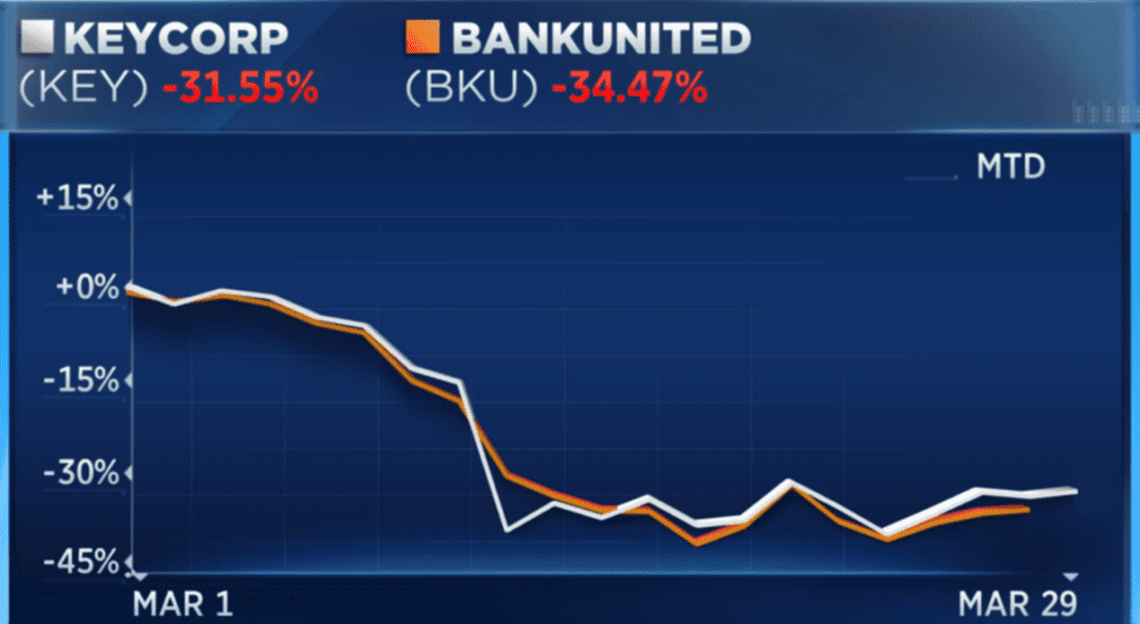 Akcie BankUnited i KeyCorp ztratily tento měsíc více než 30 %.
