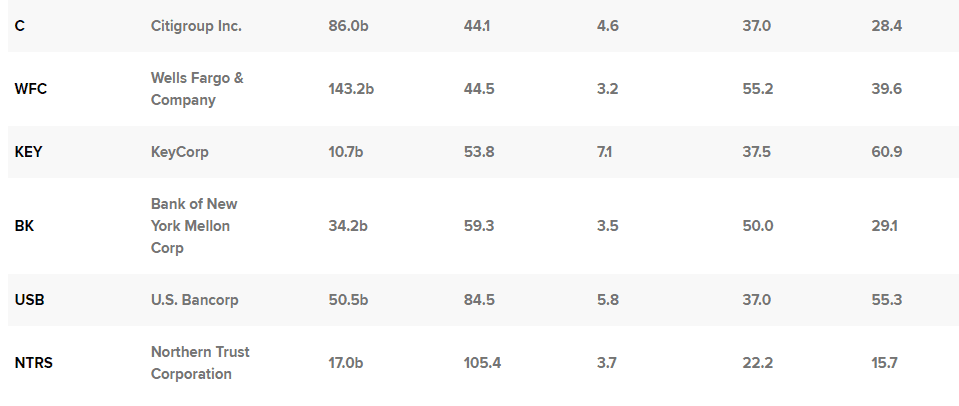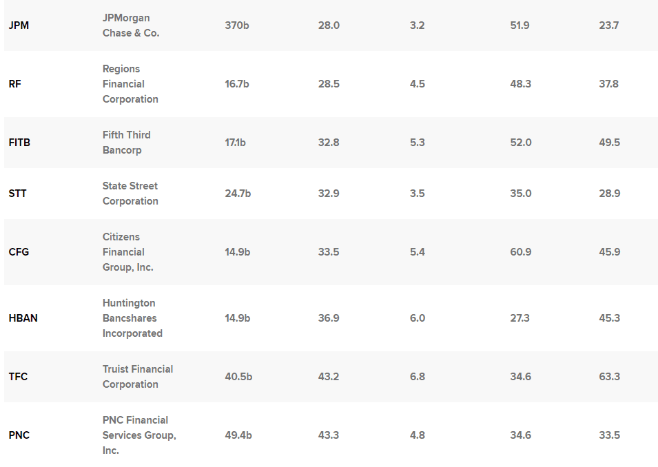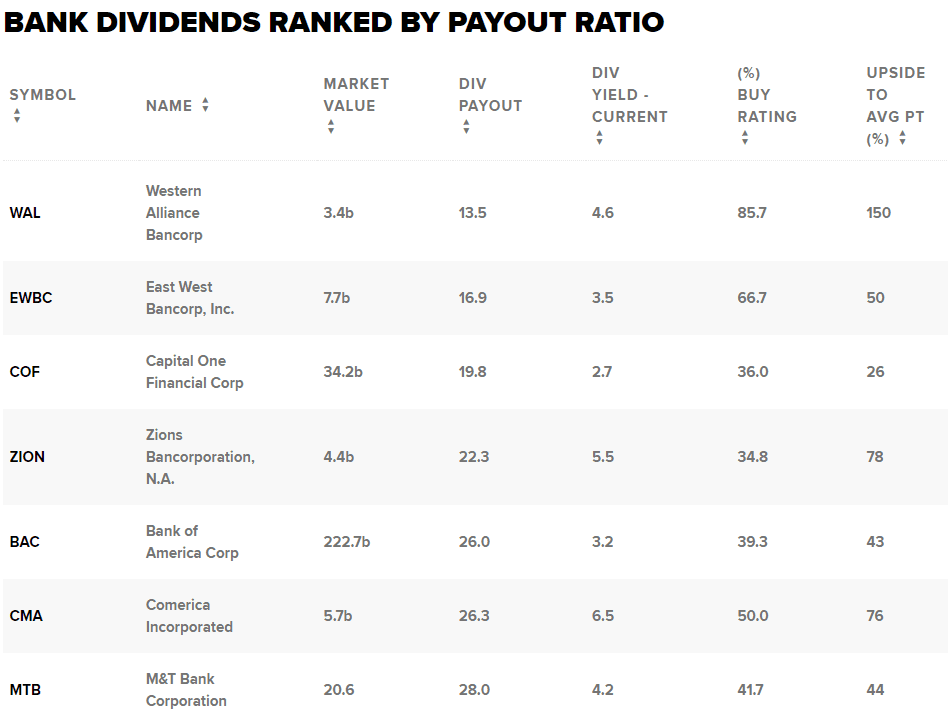 Pro ověření reality provedla CNBC screening akcií v ETF fondu Invesco KBW Bank (KBWB) a seřadila je podle nejnižšího dividendového výplatního poměru, který měří dividendy jako procento čistého zisku. Podívali jsme se také na samotné výnosy a na procento analytiků na straně prodeje, kteří banku hodnotí jako kupující, a na potenciální růst, pokud by akcie dosáhly průměrné cílové ceny akcií analytiků.
