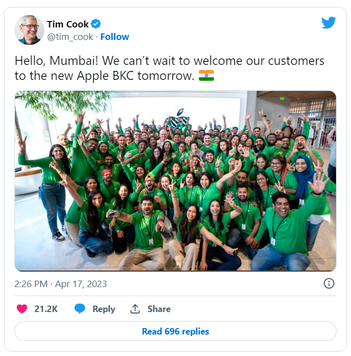 Cook dlouhodobě považuje Indii za klíčový trh pro budoucnost společnosti Apple a v únoru prohlásil, že je „býčí“ ohledně páté největší ekonomiky světa a společnost do tohoto trhu vkládá „značné množství energie“. Cook přijel do Indie na otevření obchodu téměř sedm let po své první návštěvě ve funkci generálního ředitele společnosti Apple.