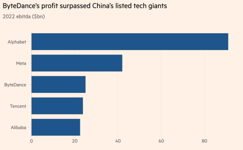 Tento nárůst pomohl společnosti ByteDance, jejíž hodnota byla v loňském roce oceněna na 300 miliard USD, překonat čínské technologické giganty kótované na burze, společnost Tencent a skupinu Alibaba zabývající se elektronickým obchodem, které za rok 2022 vykázaly ebitdu ve výši 23,9, resp. 22,5 miliardy USD. Obě skupiny byly těžce zasaženy dvouletým regulačním zásahem Pekingu proti technologickým gigantům v zemi.