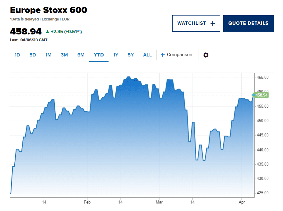 Index Europe Stoxx 600 vzrostl v prvním čtvrtletí o 7,7 % a překonal tak 7% nárůst indexu S&P 500. Tento zisk rovněž navázal na 9,6% nárůst indexu Stoxx 600 ve čtvrtém čtvrtletí roku 2022. Od začátku roku do dnešního dne evropský benchmark vzrostl o 8 %.