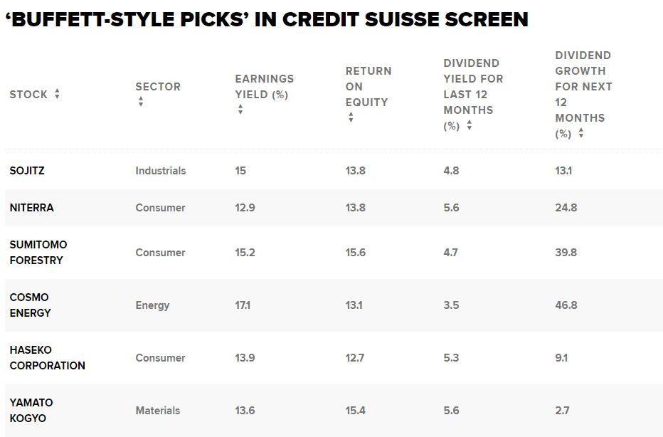 S ohledem na tento vývoj analytici Credit Suisse v poznámce uvedli, že v Japonsku prověřili akcie, které jsou „výběrem v Buffettově stylu“ – to znamená, že mají vlastnosti typické pro Buffettova držení.