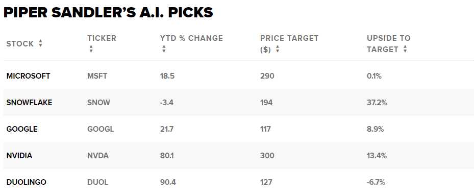 „Generativní umělou inteligenci považujeme za příští velkou technologickou revoluci, která by mohla mít dalekosáhlé důsledky pro spotřebitelský i podnikový sektor,“ napsal analytik Brent Bracelin v páteční zprávě klientům a označil generativní umělou inteligenci za „příští technologickou revoluci za více než 100 miliard dolarů“.Předpovídá, že do roku 2030 dosáhnou příjmy z reklamy ve vyhledávání a z podnikových aplikací s využitím AI 47, respektive 53 miliard dolarů, přičemž do konce letošního roku se předpokládalo, že toto odvětví dosáhne pouze 2 miliard dolarů.„Demokratizace základních velkých jazykových modelů prostřednictvím rozhraní API naznačuje, že rychlé tempo inovací by mohlo v roce 2023 a v roce 2024 nastat nebývalým tempem, přičemž jako jeden z faktorů bránících širšímu přijetí se v příštích 1 až 3 letech objeví potenciální nedostatek grafických procesorových jednotek,“ uvedl Bracelin.Výběr akcií od společnosti z Wall Street přichází v době, kdy generativní umělá inteligence dělá vlny napříč technologickým sektorem v návaznosti na debut ChatGPT na trhu. Konverzační chatbot na konci loňského roku upoutal pozornost Silicon Valley a donutil společnosti přehodnotit, jak mohou tyto nástroje využít ke zlepšení svého podnikání.Společnost Amazon se ve čtvrtek stala poslední megacap společností, která se vyjádřila ke generativnímu trendu umělé inteligence, a její generální ředitel Andy Jassy pro CNBC uvedl, že e-commerce gigant pracuje na vlastních velkých jazykových modelech, které by potenciálně mohly zlepšit „prakticky každou zákaznickou zkušenost“. Amazon Web Services také spouští službu Bedrock, generativní AI, která je zaměřena na vývojáře.Vzhledem k tomuto nastavení odvětví jmenovala společnost Piper Sandler některé ze svých nejlepších tipů pro tento rostoucí obor. Zde jsou některé ze společností, které se dostaly do výběru:Chcete využít této příležitosti?Není žádným překvapením, že se na seznam dostala společnost Microsoft , která podporuje společnost OpenAI, výrobce ChatGPT. Společnost také na začátku tohoto roku provedla řadu doplňků umělé inteligence do svého vyhledávače Bing.Zdálo se, že Microsoft vyhrál první marketingovou bitvu, ale Piper Sandler vidí společnost Alphabet jako dobře připravenou na AI vzhledem k jejímu dlouholetému využívání AI a strojového učení ve svých vyhledávacích produktech. Firma rovněž považuje vyhledávací aktivity společnosti za podhodnocené.Akcie společnosti Alphabet v roce 2023 vzrostly o zhruba 22 % poté, co na začátku roku čelily poklesu kvůli obavám, že prohrávají válku s AI po zavedení chatbota Bard. Cílová cena 117 USD od společnosti Piper Sandler znamená téměř 9% nárůst oproti čtvrtečnímu závěru.Podle společnosti Piper Sandler zaznamenaly společnosti Google a Bing dohromady v letošním roce zatím o 13 % vyšší objemy vyhledávání, přičemž denní počet stažení mobilních aplikací Bing vzrostl na více než 100 000 oproti 13 000 před rokem. To však stále zaostává za vyhledávačem Google, poznamenala firma.Společnost Nvidia se v posledních měsících dostala do centra pozornosti v boji o umělou inteligenci vzhledem ke svému téměř monopolnímu postavení a dlouhodobé sázce na výrobu grafických procesorů, které jsou nyní potřebné pro pohon těchto rostoucích modelů.V letošním roce akcie společnosti vzrostly o více než 80 %. Její ocenění dosáhlo prémiové hodnoty, protože investoři vsadili na nedílnou roli výrobce čipů v oblasti AI. Podle Wall Street však potenciál společnosti ospravedlňuje její ocenění.„Podle našeho názoru je Nvidia jasným lídrem v oblasti generativní umělé inteligence, protože odhadujeme, že 80 % všech pracovních zátěží v oblasti umělé inteligence v současnosti běží na čipech NVDA,“ napsal analytik Harsh Kumar. „Do budoucna má Nvidia možnost tento podíl dále zhodnotit díky svým softwarovým řešením, která zvyšují hodnotu pro zákazníky v oblasti AI.“Mezi další potenciální vítěze závodu o AI patří společnost Snowflake , která se zabývá datovým cloudem. Bracelin uvedl její historii v oblasti datových aplikací poháněných AI a nové inovace, které by měly společnost situovat do pozice „klíčového prostředníka pracovních postupů a vývoje modelů ML“. Cílová cena společnosti ve výši 194 USD naznačuje, že by akcie mohly oproti čtvrtečnímu závěru vzrůst o více než 37 %.Arvind Ramnani vyzdvihl jako dalšího beneficienta software pro učení jazyků Duolingo vzhledem k jeho včasným investicím do schopností AI a „silnému základu“ v těchto nástrojích.„Jsme přesvědčeni o jeho schopnostech využít nedávný pokrok v generativní umělé inteligenci v celém odvětví ke zlepšení při tvorbě obsahu: jak zlepšení stávajícího obsahu, tak zavedení obsahu na pokročilé úrovni,“ napsal Ramnani.Navzdory nárůstu akcií očekává společnost Piper Sandler téměř 7% pokles akcií oproti čtvrtečnímu závěru.