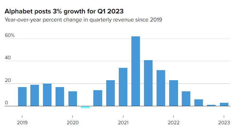 Tržby společnosti Alphabet podle zprávy o výsledcích vzrostly o 3 % na 69,79 miliardy dolarů z 68 miliard dolarů před rokem. Společnost se po téměř dvou desetiletích soustavné a rychlé expanze potácí v několikatýdenním období nízkociferného růstu tržeb. Vzhledem k tomu, že od loňského roku sílí obavy z recese, inzerenti snižují rozpočty na online marketing, což způsobuje chaos ve společnostech Google, Facebook a dalších.