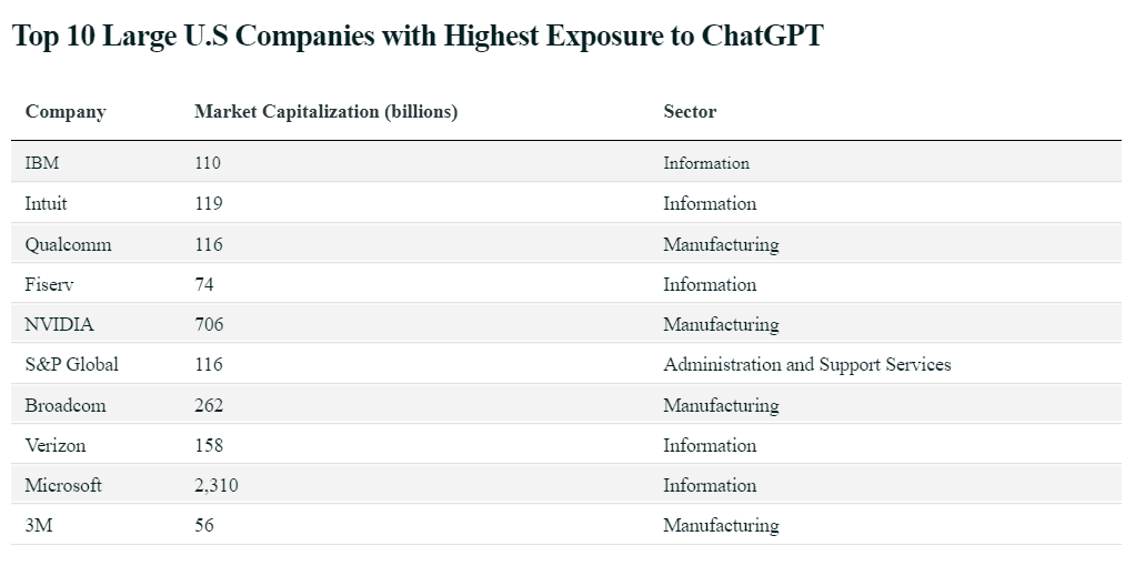 Tato zpráva nás příliš nepřekvapuje. Obě společnosti jsou na našem krátkém seznamu velkých amerických firem, které jsou nejvíce vystaveny ChatGPT, chatbotu AI, který v listopadu zveřejnila výzkumná laboratoř OpenAI. Seznam jsme vytvořili v rámci nové studie, která konstruuje a analyzuje vystavení zaměstnanců generativní AI na úrovni firem. Vycházíme z předpokladu, že úkoly, které vykonávají pracovní síly více exponovaných firem, mohou být snadněji prováděny aplikacemi generativní AI ve srovnání s úkoly, které vykonávají pracovní síly méně exponovaných firem (a odvětví).