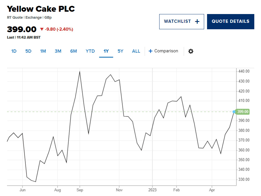 Hodnota akcií společnosti Yellow Cake je úzce spjata s cenou uranu, protože společnost přehodnocuje své podíly na základě aktuální spotové ceny. To znamená, že pokud ceny uranu porostou, měla by se zvýšit i hodnota akcií společnosti Yellow Cake.