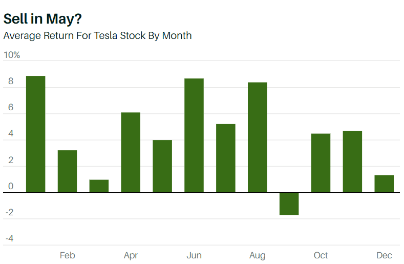 Průměrný zisk mezi koncem dubna a zbytkem roku je 51 %. A akcie rostly v devíti z posledních 12 let. Navíc letní měsíce bývají pro akcie Tesla silné. Průměrný zisk v červnu, červenci a srpnu se pohybuje kolem 7 % a červen a srpen byly nejlepšími měsíci z hlediska výnosů akcií Tesla.
