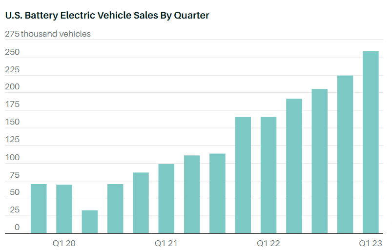 První čtvrtletí roku 2023 bylo rekordní v prodeji bateriových elektromobilů v USA a po celém světě se prodej elektromobilů za posledních 12 měsíců zvýšil přibližně o 50 % ve srovnání s obdobím před rokem.