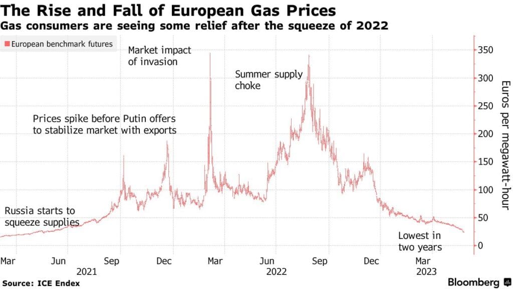 Evropské ceny plynu klesly na nejnižší úroveň od poloviny roku 2021, kdy Rusko před invazí na Ukrajinu teprve začalo omezovat dodávky, což pomohlo zvrátit prudký nárůst inflace a ulevilo spotřebitelům.
