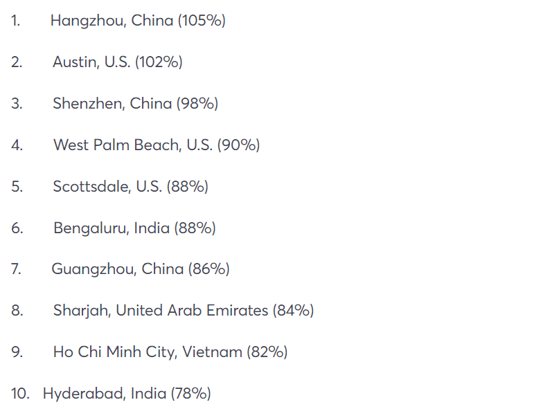 Čínské Chang-čou (Hangzhou) se dostalo na první místo seznamu hodnotícího nejrychleji rostoucí milionářské destinace. Zpráva zjistila, že mezi lety 2012 a 2022 vzrostl počet osob žijících v této zemi, které disponují investovatelným majetkem v hodnotě více než 1 milion dolarů, o 105 %.