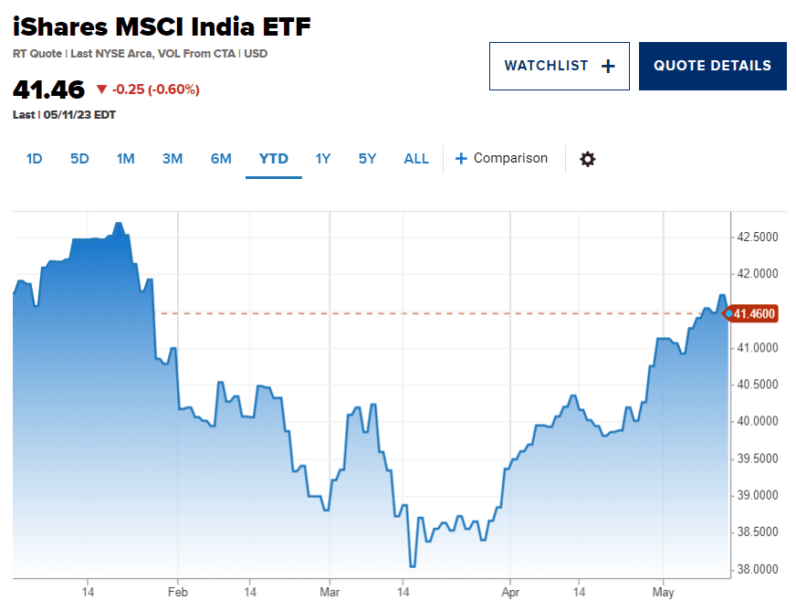 Indické akcie v letošním roce zaostávají, protože mnozí investoři považují trh po jeho loňském překonání za příliš drahý. ETF iShares MSCI India (INDA) v roce 2023 klesl o 0,9 %, zatímco ETF iShares MSCI Emerging Markets (EEM) vzrostl o 2,3 %. V poslední době se však tento trend začal obracet. INDA je v tomto čtvrtletí o 5,1 % výše, zatímco EEM je zhruba o 1,7 % níže.