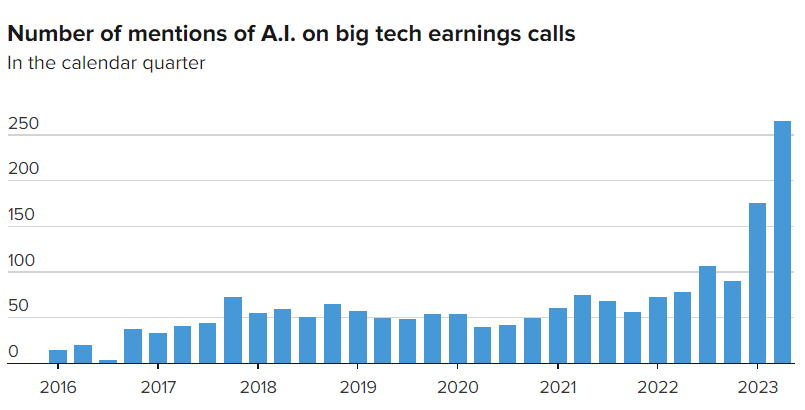 Jen v telefonátech společností z oblasti Big Tech byla AI zmíněna 265krát. To je více než 17krát více než počet zmínek, které se jí dostalo během hovorů konaných v prvním čtvrtletí roku 2016.