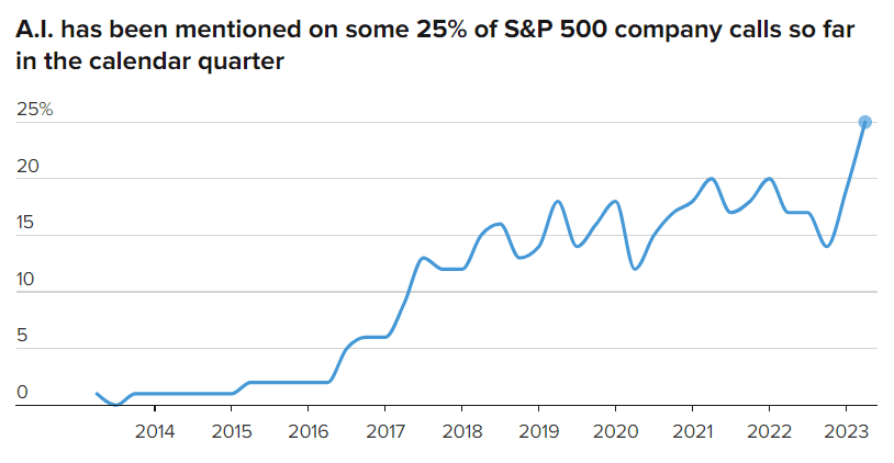 Od minulého pátečního odpoledne, kdy polovina společností z indexu S&P 500 oznámila své hospodářské výsledky, se přibližně čtvrtina z nich v některém bodě svých čtvrtletních hovorů s analytiky zmínila o umělé inteligenci. To je největší podíl společností, které se o této technologii zmínily přinejmenším od roku 2016. Pro srovnání, v prvním čtvrtletí roku 2016 se v hovorech s analytiky o AI zmínilo méně než 5 % společností.