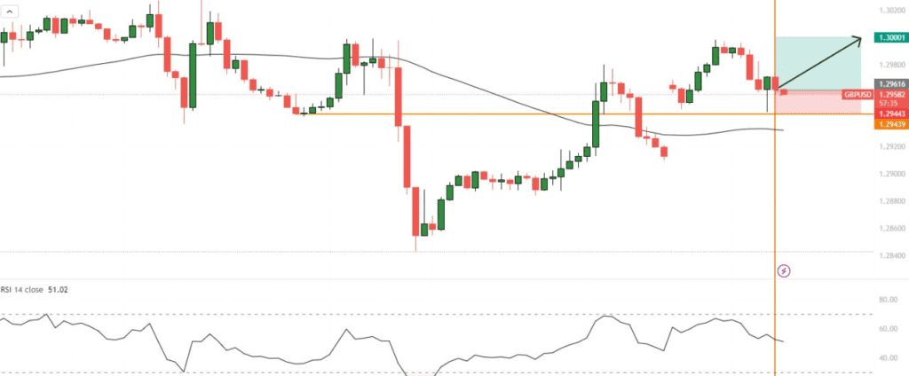 Na grafu můžeme vidět, že GBP/USD prorazil klíčovou úroveň rezistence, která byla identifikována na 1,2981. Tento průraz signalizuje možnou pokračující sílu býků na trhu, což podporuje i rostoucí klouzavý průměr. Klouzavý průměr zde působí jako dynamická podpora a naznačuje, že cena může nadále stoupat, pokud nedojde k výraznějšímu obratu trendu.