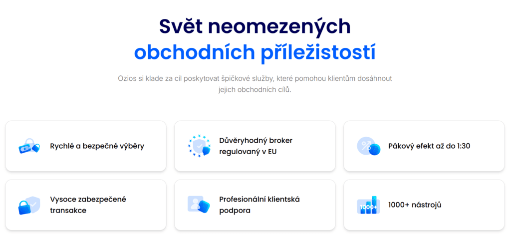 Pokud jste spíše obchodníci orientovaní na kryptoměny, tento broker pro vás pravděpodobně nebude zajímavý, ale stojí za to, aby byl recenzován.Ozios je broker plně orientovaný na CFD produkty a mezi obchodníky je stále oblíbenější.Pojďme si ale lehce připomenout výhody obchodování s CFD.Obchodování s různými nástroji CFD může investorům a obchodníkům nabídnout několik výhod. Zaprvé, CFD poskytují příležitost diverzifikovat své portfolio napříč různými třídami aktiv, včetně akcií, komodit, indexů a kryptoměn. Diverzifikace je klíčovou strategií řízení rizik, která pomáhá zmírnit dopad špatné výkonnosti jednoho aktiva.Za druhé, flexibilita CFD umožňuje obchodníkům profitovat z rostoucích i klesajících trhů. To je výhodné zejména na volatilních trzích, kde se tradiční investice mohou potýkat s problémy. CFD umožňují obchodníkům využít tržních trendů a profitovat z cenových pohybů v obou směrech.Pákový efekt, který CFD poskytují, navíc umožňuje obchodníkům ovládat větší pozice s menším kapitálem. Pákový efekt sice zvětšuje potenciální zisky, ale je nezbytné účinně řídit rizika.Kromě toho možnost obchodovat s různorodými aktivy prostřednictvím CFD poskytuje příležitosti k účasti na globálním trhu, což umožňuje obchodníkům využít ekonomických událostí a trendů v různých regionech.Chcete využít této příležitosti?Tyto informace by na úvod mohly být dostačující. Nyní se ponořme do činnosti společnosti Ozios hlouběji.Bezpečnost a licencování makléřů jsou v oblasti finančního obchodování nejdůležitějšími aspekty, které zajišťují důvěryhodné a chráněné prostředí pro investory. Zaprvé, bezpečnost chrání finanční transakce a citlivé informace a podporuje důvěru mezi obchodníky a makléřskou platformou. Bezpečná platforma s robustním šifrováním a autentizačními opatřeními chrání uživatele před potenciálními kybernetickými hrozbami a vzbuzuje důvěru v bezpečnost jejich investic.Kromě toho je klíčovým regulačním aspektem licencování makléřů. Licencovaný makléř znamená dodržování daných standardů, předpisů a etických postupů pro konkrétní odvětví. Regulační orgány stanovují pokyny na ochranu investorů, ověřují finanční stabilitu makléře a zajišťují poctivé tržní postupy. Licence působí jako důkaz závazku makléře k transparentnosti a odpovědnosti.Výběr licencovaného makléře poskytuje obchodníkům možnost odvolání v případě sporů a právní ochranu. Zajišťuje, že makléř působí v právním rámci, čímž se snižuje riziko podvodného jednání. Lze shrnout, že symbiotický vztah mezi bezpečnostními opatřeními a licencováním brokera je základem pro vytvoření bezpečného, spolehlivého a etického obchodního prostředí.Společnost Ozios získala akreditaci jako makléř od Kyperské komise pro cenné papíry . Pečlivě jsme dokumenty prověřili a neobjevili jsme žádné důkazy, které by naznačovaly, že společnost Ozios nepracuje na základě licence. Je ověřeno, že Ozios je spolehlivý makléř.Podívejme se na obchodní nástroj, který makléř nabízí na svých webových stránkách po přezkoumání jeho právní sekce.Diverzifikované portfolio u důvěryhodného makléře znamená dobře vyvážený mix různých tříd aktiv v rámci investičního nebo obchodního účtu. Různá aktiva, jako jsou akcie, dluhopisy, komodity a měny, mohou pomoci rozložit riziko a snížit dopad špatné výkonnosti jedné investice. Důvěryhodní makléři často podporují diverzifikaci jako strategii řízení rizik, jejímž cílem je poskytnout klientům stabilnější a odolnější investiční portfolio. Tento přístup je v souladu s cílem zachovat kapitál a dosáhnout dlouhodobých finančních cílů při minimalizaci expozice vůči volatilitě konkrétního trhu nebo aktiva.Ale k čemu tyto informace slouží? Jde o to, že rozsáhlé portfolio je známkou spolehlivosti makléře a Ozios se takovým portfoliem může v dobrém slova smyslu pochlubit.Makléř Ozios nabízí akcie a všechny varianty s nástroji CFD, a to: