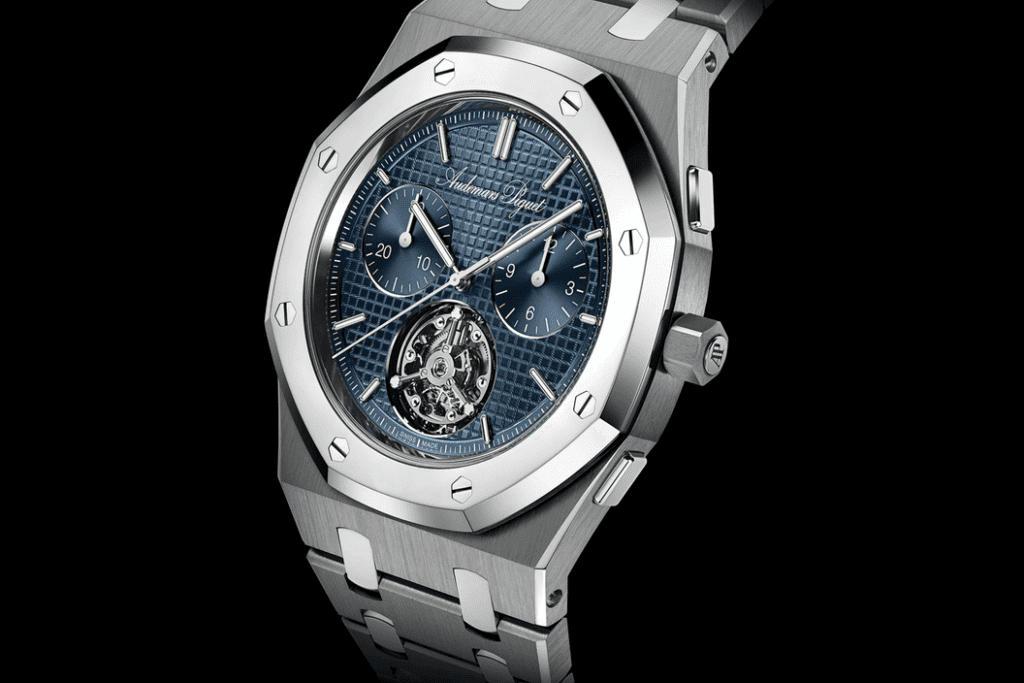 Navzdory technické komplexnosti si model RD#5 zachovává charakteristickou estetiku Royal Oak Extra-Thin Jumbo. Na první pohled zaujme tmavě modrý ciferník Petite Tapisserie, který je doplněn rhodiovanými indexy z 18karátového růžového zlata ve tvaru „van“. Ručičky z bílého zlata, dvojice chronografických registrů na třetí a deváté hodině a létající tourbillon na pozici šest hodin vytvářejí vyváženou a přehlednou kompozici.