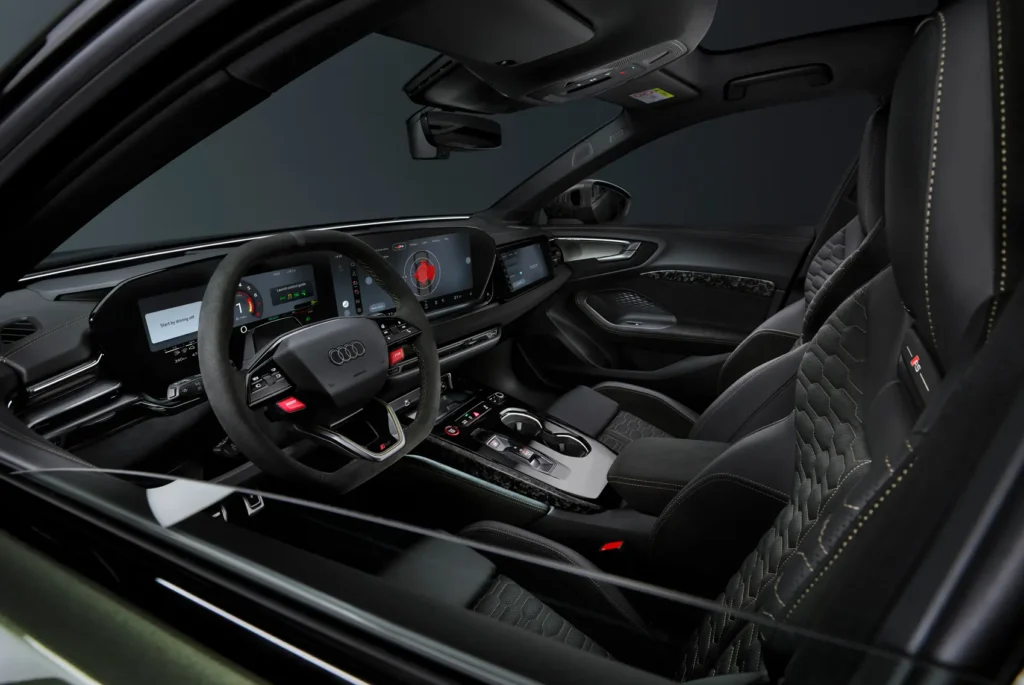 Interiér sází na digitální modernu s dominantním 14,5palcovým dotykovým displejem infotainmentu, který je mírně natočen k řidiči. Kabina je doslova poseta logy RS, využívá prémiovou kůži s kontrastním prošíváním a karbonové dekory. Přestože je palubní deska koncepčně podobná modelu S5, sportovní sedadla s integrovanými opěrkami hlavy a specifické zobrazení digitálního přístrojového štítu s telemetrií jasně definují příslušnost k elitní rodině vozů z Ingolstadtu. Prostornost interiéru zůstává zachována, což z RS5 činí jeden z nejuniverzálnějších supersedanů současnosti.